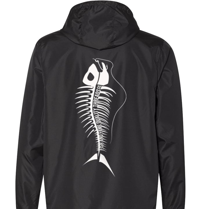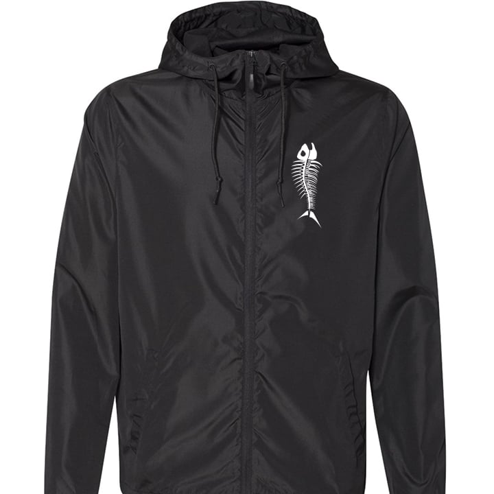 Fleshless Windbreaker, black, 4.5 oz. e-z weight 100% polyester fabric w/interior water-resistant coating, full zipper pull & rubber zipper pull tab, single layer body with fine mesh hood liner, scuba neck, welt pockets w/mesh pocket interior, toggles at waistband, elastic cuffs.