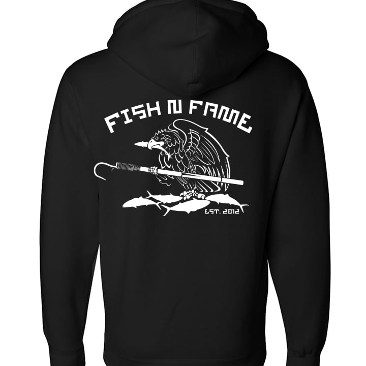 Gaff & Eagle Pullover, black, 10oz. heavyweight, preshrunk 50/50 cotton/polyester, pill-resistant and soft air-jet spun yarn, double-lined hood with matching drawstring, double-needle stitching throughout garment, front pouch pocket.