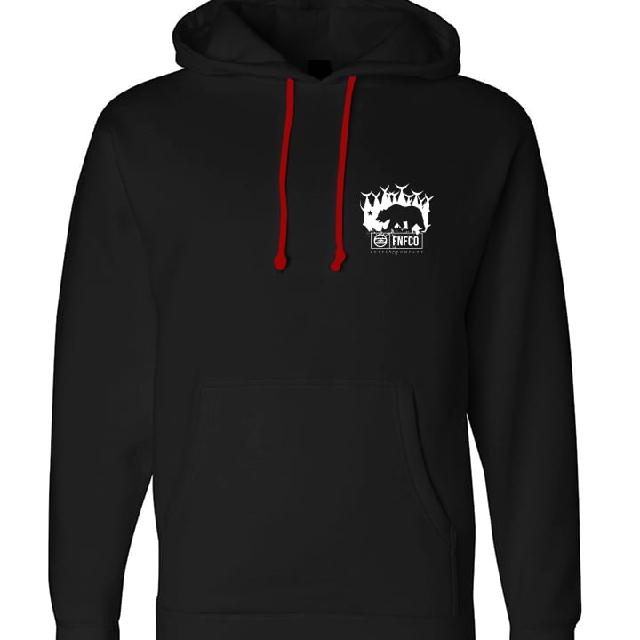 No Limits Republic Pullover, black, 10oz. heavyweight, preshrunk 50/50 cotton/polyester, pill-resistant and soft air-jet spun yarn, double-lined hood with red